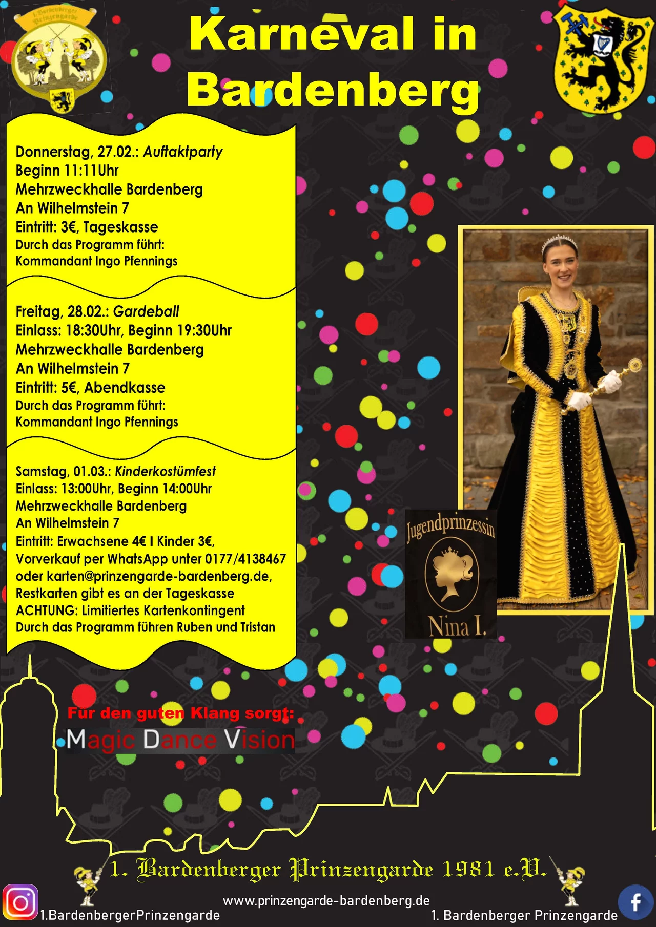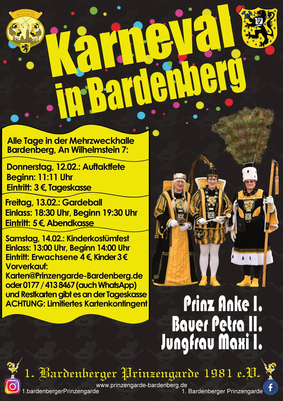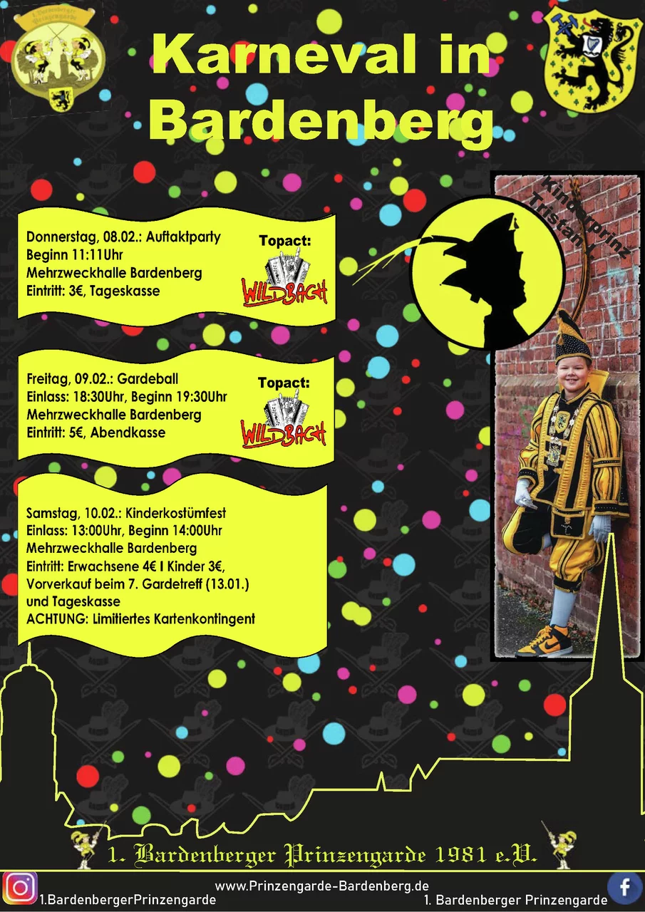 Am Karnevalsfreitag, 9. Februar, heißt es dann ab 19.30 Uhr ebenfalls in der Mehrzweckhalle An Wilhelmstein „Gardeball“ der Prinzengarde, Eintritt 5 €. Gleich mehrere hochkarätige Karnevalsvereine machen ihre Aufwartung (u.a. der Öcher Prinz Thomas IV.), aber es wird genug Zeit für Tanz geben. Highlight auch hier sind sicherlich die Band Wildbach aus Tirol, Kinderprinz Tristan I. und die Auftritte der kleinen und großen Aktiven der Bardenberger Prinzengarde.