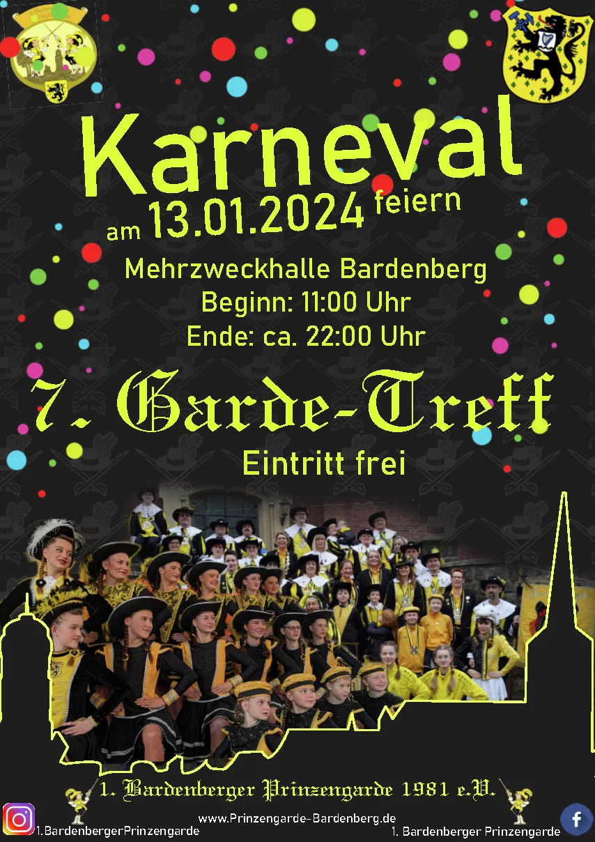 Im Dörflein selbst geht es am übernächsten Samstag 13. Januar, zum ersten Mal so richtig hoch her, dann heißt es in der Mehrzweckhalle An Wilhelmstein ab 11 Uhr über viele Stunden hinweg 7. Garde-Treff der 1. Bardenberger Prinzengarde. Fast 12 Stunden ohne Unterbrechung zeigen Karnevalsvereine aus Nah und Fern - bei freiem Eintritt - ihr karnevalistisches Können. Dies sind natürlich nicht nur tolle Tänze, es präsentieren auch einige Tollitäten ihr aktuelles Programm. Selbstverständlich wird dies für den Ortsteil Bardenberg Kinderprinz Tristan I. mit seinem Gefolge „Team Tristan“ sein. Auch alle anderen Würselener Tollitäten werden natürlich dabei sein. Aber auch über die Stadtgrenzen hinaus sind Tollitäten aus Kohlscheid, Herzogenrath und Eilendorf vertreten. Die auftretenden Vereine nehmen selbst größte Strecken in Kauf, um in Bardenberg dabei zu sein.